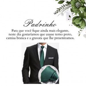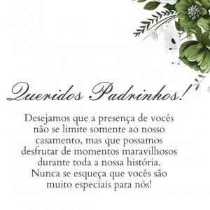Aos nossos queridos padrinhos: É uma emoção única e indescritível tê-los ao nosso lado e poder partilhar com vocês toda felicidade dessa nova etapa em nossas vidas: nosso casamento! Por isso, desejamos tê-los como testemunhas do nosso sonho e do nosso amor! Mais do que isso, queremos vocês caminhando ao nosso lado em todas as fases das nossas vidas!