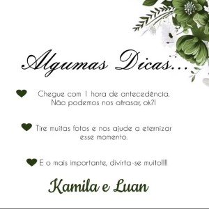 Gostaríamos muito de contar com a presença de todos vocês no momento em que nossa união será abençoada diante de Deus! A cerimônia será rápida e tentaremos ser extremamente pontuais. Contamos com vocês! Dia 02 de maio de 2026, às 15:30. Rodovia SC 370 km 174, número 4697 - São Martinho, Tubarão- SC, 88708-800